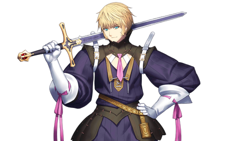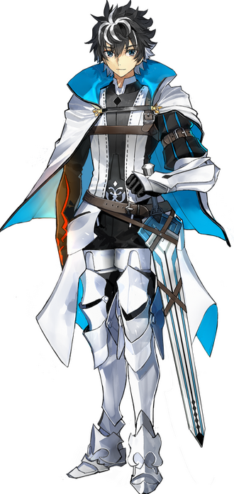 The shoulder armor is usually invisible due to the cape Astolfo tends to wear, which is usually a white, fur trimmed cloth cape held in place by a golden chain just above some leather armor protecting his chest and neck region.