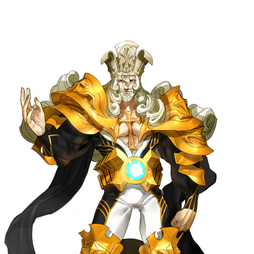 His hands, wrists and elbows are protected by white gauntlets featuring golden ornaments.