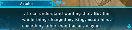 Whilst Astolfo could understand how one would want that he could also clearly see how it warped his King - almost into something that was other than human.